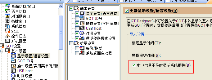 轉(zhuǎn)換好后,點軟件左邊的系統(tǒng),GOT設(shè)置,顯示設(shè)置/語言設(shè)備,把電池電量不足的勾去掉。
