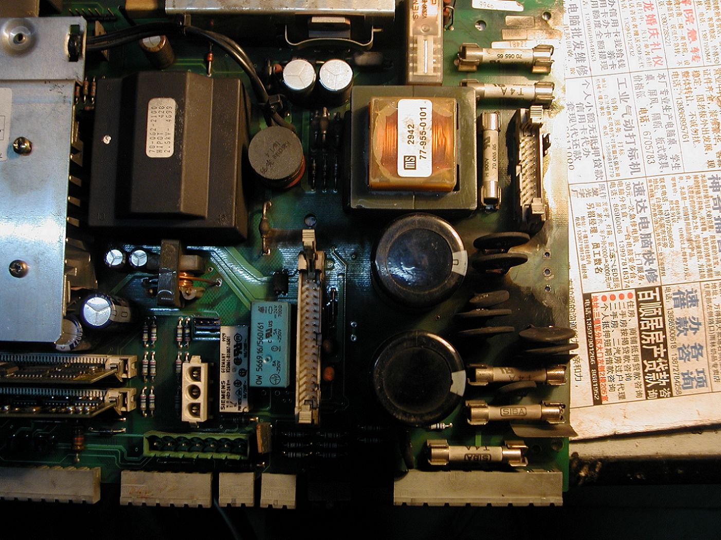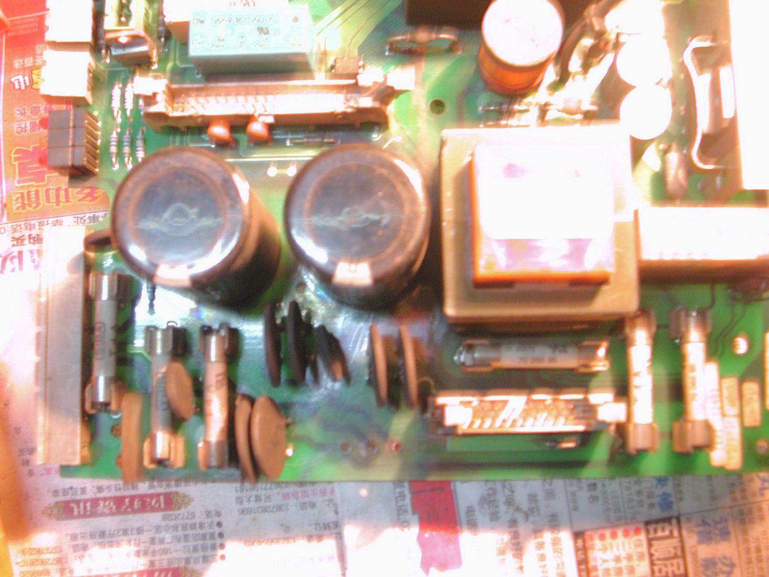 其實這一問題我們已解決(此事發(fā)生在今年三月中旬).為什么拿出來讓大家討論,主要是讓大家吸取我們這次教訓(xùn)避免造成大的損失.事故的原因是由于維修工清潔板卡時,在扒插各種電纜插頭時用力不當造成插座與印刷電路板脫焊,故再啟動時由于電流大引起拉弧最后就造成大家上次見到的那張圖片所呈現(xiàn)出的那種慘樣.電源插座掉下來了(見下圖)留下空位.清潔處理后的電路板如下圖.