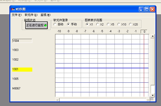 我用“梯形圖邏輯測試啟動”中的繼電器內存監視里的時序圖啟動,結果顯示全是直線,我雖然看不懂時序圖,但我自己參照資料上的圖片應該會有若干個上升沿和下降沿啊,請大家指教,非常感謝