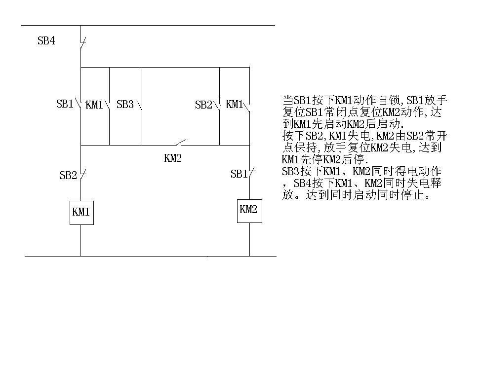 引用引用第72樓hds1990于2012-05-30 18:56發(fā)表的 :[attachment=85237]看看這個(gè)行不?我不是電工,業(yè)余畫(huà)畫(huà)。工作過(guò)程:1. 按下SB1,KM1啟動(dòng)并自鎖,實(shí)現(xiàn)先啟動(dòng)電機(jī)M1;然后可以按下SB4啟動(dòng)KM2并自鎖,實(shí)現(xiàn)后啟動(dòng)電機(jī)M2。按下SB2停止電機(jī)M1,實(shí)現(xiàn)先停止;再按下SB3停止電機(jī)M2,實(shí)現(xiàn)后停止。2. 單獨(dú)按下SB4,同時(shí)啟動(dòng)KM1和KM2實(shí)現(xiàn)電機(jī)M1和電機(jī)M2同時(shí)啟動(dòng)并自鎖,按下SB3同時(shí)停止電機(jī)M1和電機(jī)M2。3. 以上先后次序不能亂,即SB1-(電機(jī)M1先啟動(dòng))-SB4-(電機(jī)M2啟動(dòng))-SB2-(電機(jī)M1停止)-SB3(電機(jī)M2停止)。.......