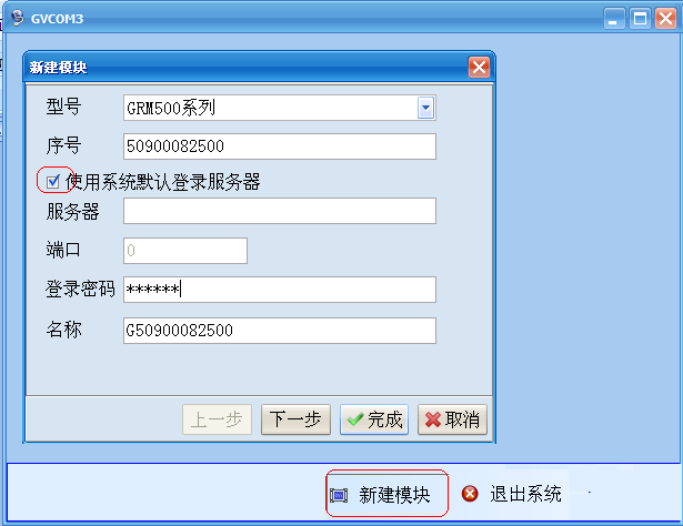 1、電腦上運(yùn)行GVCOM3軟件,點(diǎn)擊下面的“新建模塊”,輸入GRM500模塊11位序號(hào)和密碼。