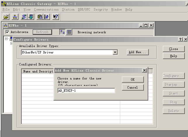4、 AB的RSLinx Classic軟件,打開Configure Drivers對(duì)話框,如下圖所示,選擇“Ethernet/IP Driver”,點(diǎn)擊“Add New…
