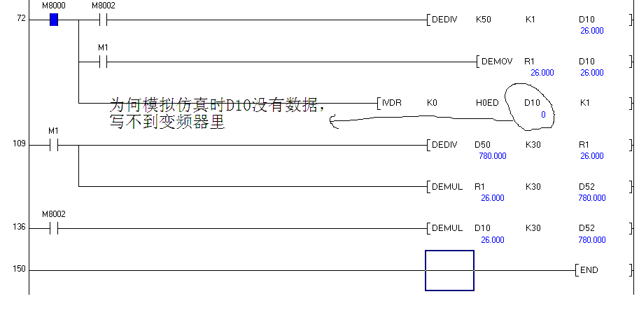 為什么這個程序不能在觸摸屏上寫入速度,試了很多次,也改了很多次。開始的時候三菱FX3U-PLC和GX-1275觸摸屏沒到貨,只能在電腦上模擬聯通,沒達到預期效果,聽三菱客服說可以的,最近產品到了我試了幾次還是不行。我想在觸摸屏上改變變頻器的速度,上面的那個程序只能改變頻率,所以我就把程序做了相應修改,我想讓在觸摸屏上輸入速度從而改變變頻器的頻率已達到改變速度。我試了好多次開始改變觸摸屏上速度,實在只能改變成30的整數倍,很無奈。哥們先幫我分析分析問題出在那?“我也試過實數指令,沒效果”