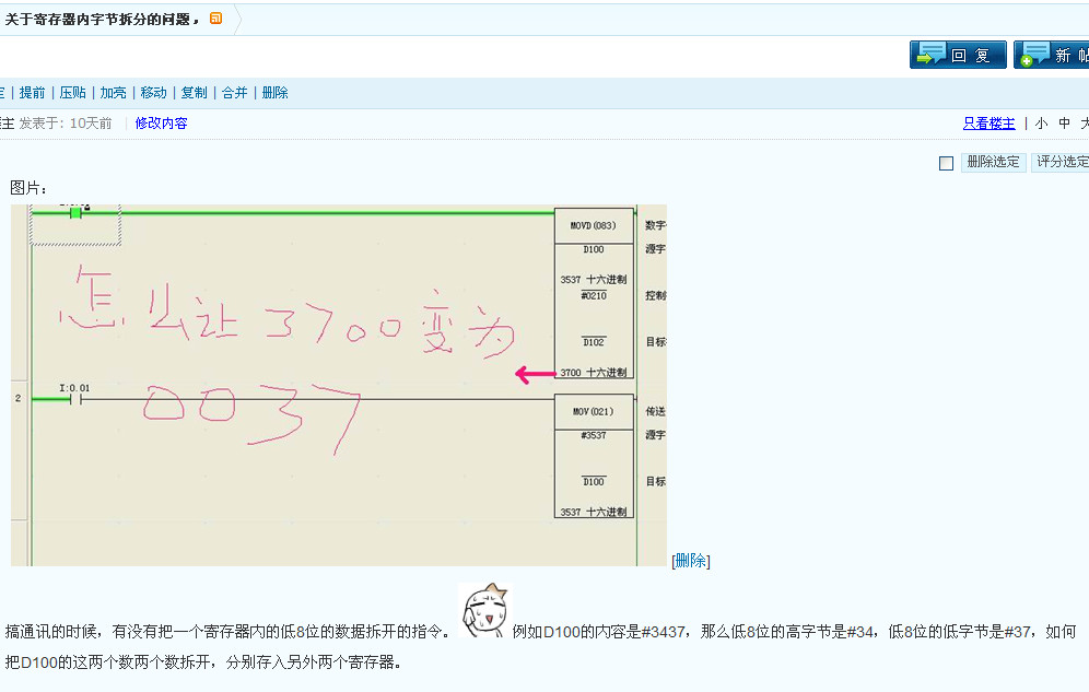 請教各位高手,歐姆龍CPM2A的內部寄存器用什么指令可以拆分開來,如D100的數據是1234,怎么可以把他分開成12到一個寄存器,34到一個寄存器,請高手們來個樣例,謝謝