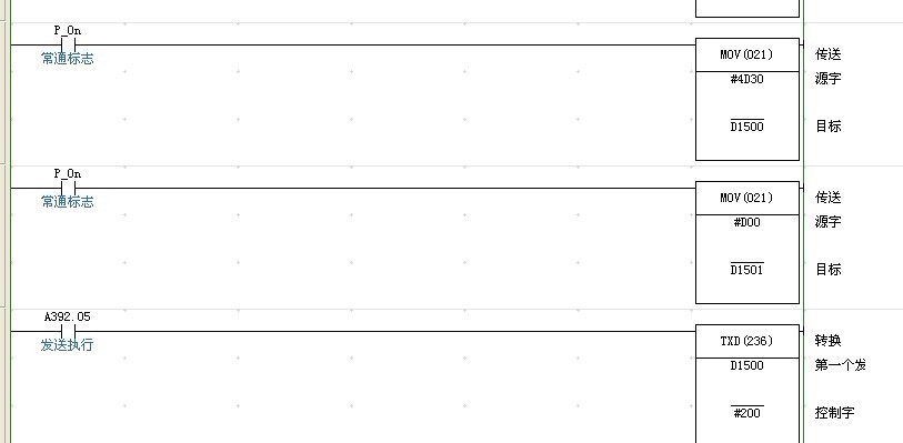 此處用的是歐姆龍無協(xié)議通信方式,TXD  s c n,s為發(fā)送數(shù)據(jù)的低通道號,成為控制字,15-12為0固定,11-8,1指串行口一輸出,2串行口二輸出,7-4,0為無RS,ER控制。3-0,0表示高字節(jié)在前。RXD 為接受指令情況類似