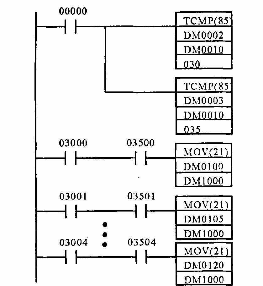 其中TCMP(85) 是OMRON 公司的COM1 型PLC 的表比較指令,當繼電器00000 由OFF 變為