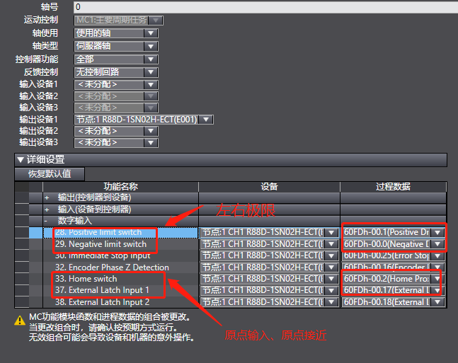 在軸“基本設置”的“詳細設置”里,分配Home switch(原點接近信號)和External Latch Signal1(原點輸入信號)的對應數(shù)字輸入。。