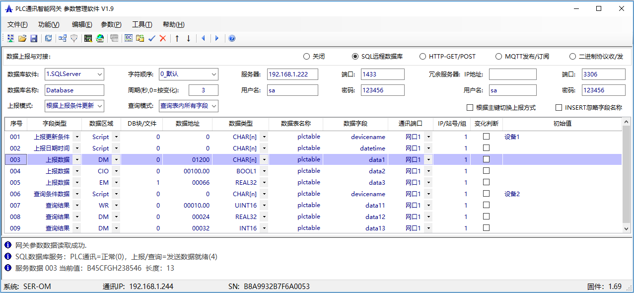 然后通過智能網關的參數軟件(在附件中),設置PLC與數據庫相關參數,包括服務器主機IP地址、端口,用戶名密碼,以及上報與查詢的模式、PLC數據地址與數據表字段的對應關系等,如下圖: