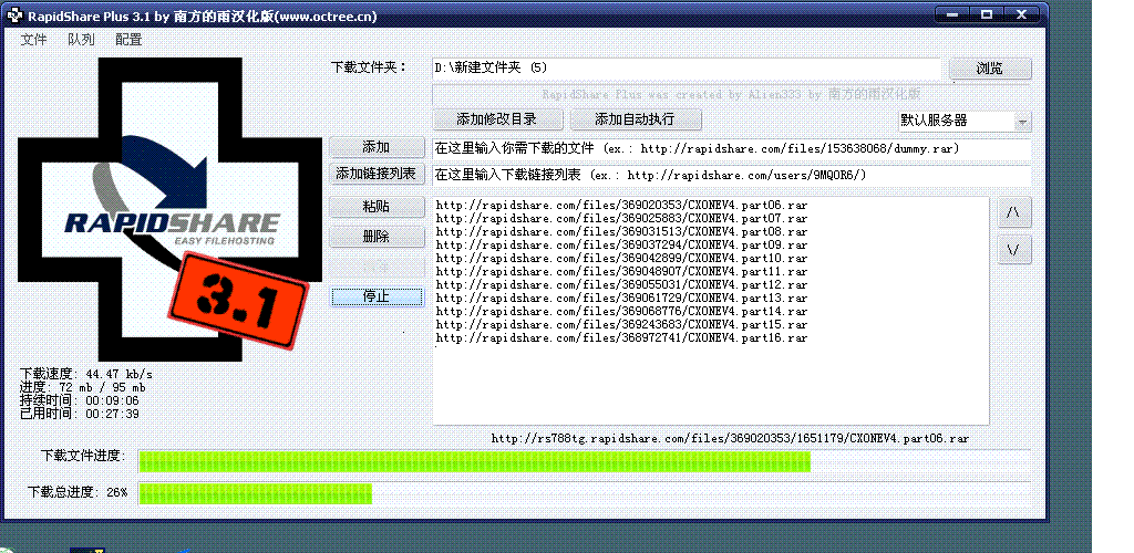 2.把以上16個(gè)地址復(fù)制全部添加到RapidShare Plus v3.1里面后(如最上面圖片,我已下了5個(gè)),點(diǎn)下載就OK,非常簡(jiǎn)單. 自動(dòng)全部下載.