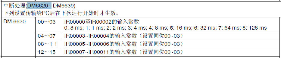 CPM1A手冊上的DM6620的00-03位表示00000-00002的輸入時間常數,其初始值為0(8ms),如果要改成1(1ms),要怎么寫程序?